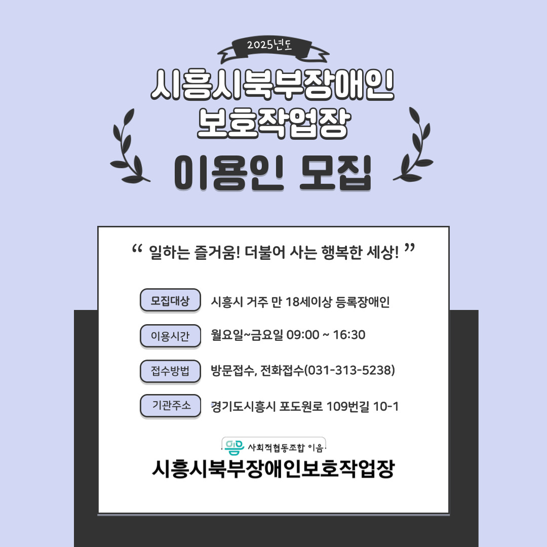 시흥시북부장애인보호작업장 이용인 모집 사무원송형철 0 46 12.12 10:04 시흥시북부장애인보호작업장에서 다음과 같이 이용인을 모집합니다! - 다 음 -○모집대상: 시흥시거주 만 18세이상 발달장애인○모집인원: 00명○이용시간: 월요일 ~ 금요일 - 근로장애인: 09:00 - 16:30 - 훈련장애인: 09:00 - 16:00○급여 및 수당: 현장평가 결과에 따라 결정 / 협의○접수방법: 방문접수, 전화접수(031-313-5238)○기관주소: 경기도 시흥시 포도원로 109번길 10-1